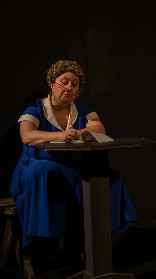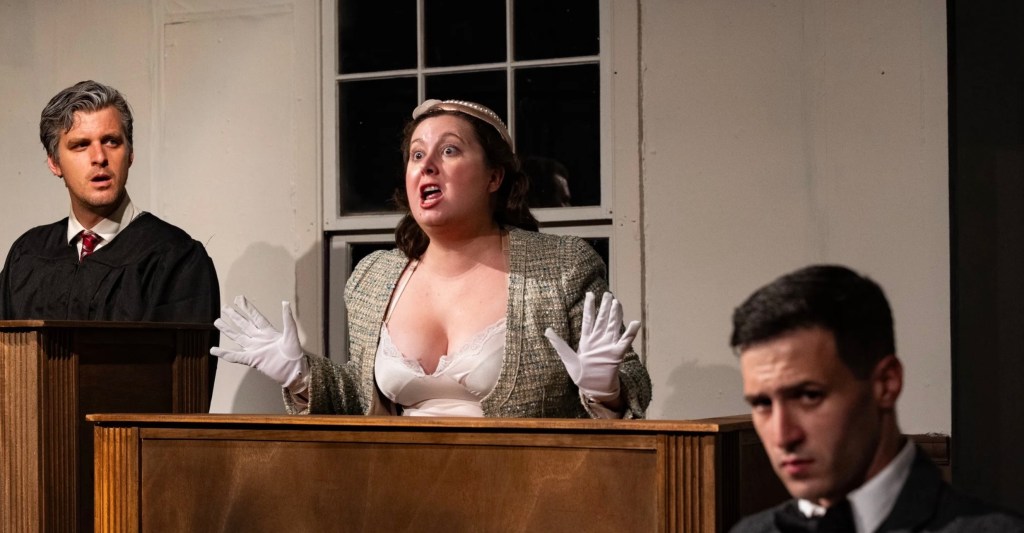 MacMath wears many hats in the show, portraying three different characters, including Mrs. Collins, an intolerant witness named Stacy, a flighty secretary, and Maria who is an idealistic immigrant.
